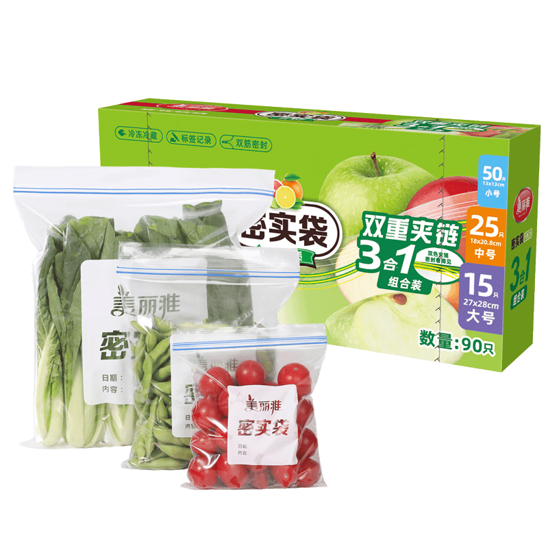 总结来说,美丽雅自封袋大中小共90只双链封口厨房冰箱冷冻收纳袋,凭仗其扎实的袋身、经用的原料、双层密封条的规划,以及便签条的实用性,肯定是您厨房收纳的抱负挑选。让咱们一同离别杂乱,让厨房变得整齐有序,享用更夸姣的日子!